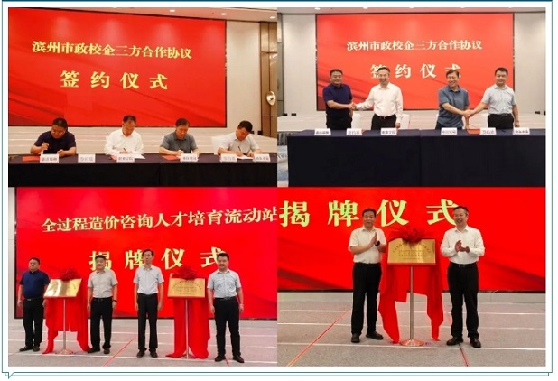 會議期間,濱州市住房和城鄉(xiāng)建設(shè)局、濱州職業(yè)學院、山東永泰建設(shè)工程咨詢有限公司共同簽署了濱州市政校企三方合作協(xié)議,省市領(lǐng)導(dǎo)同時為“全過程造價咨詢?nèi)瞬排嘤鲃诱尽苯遗啤?/strong>